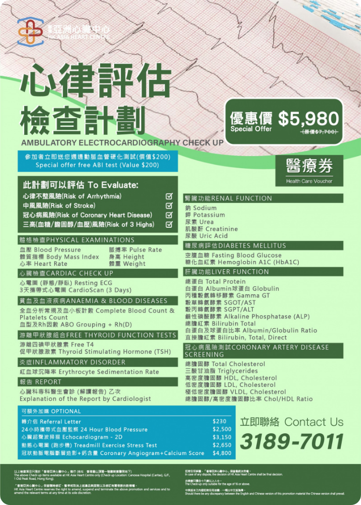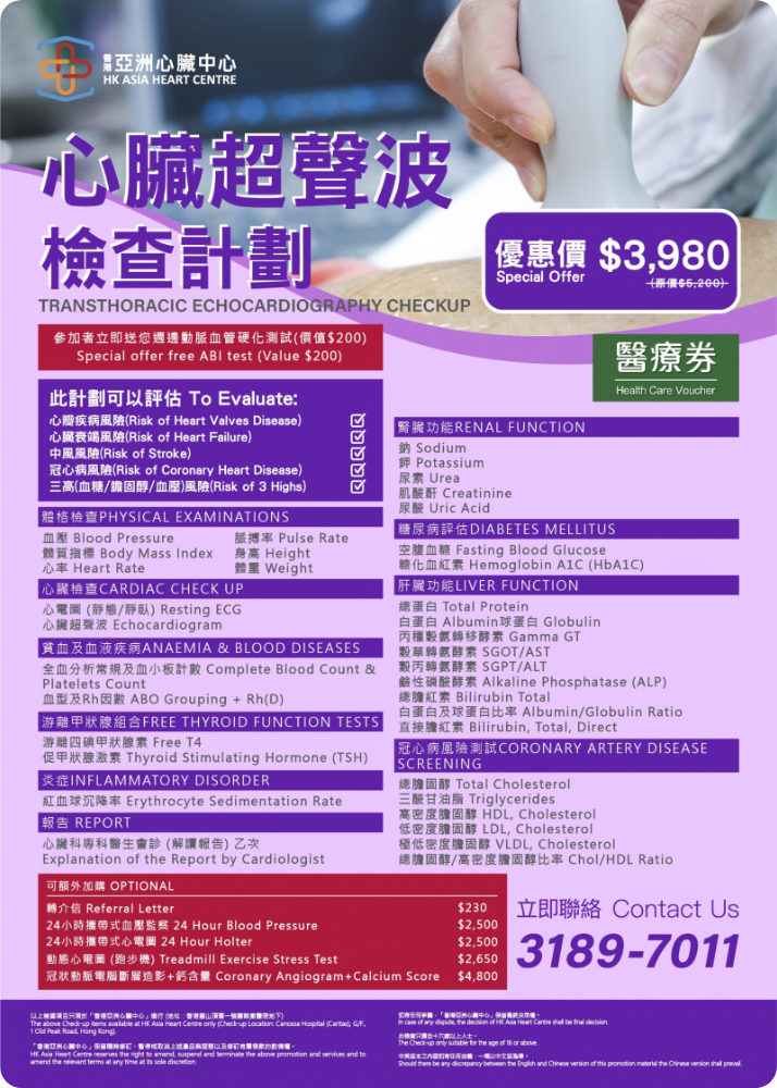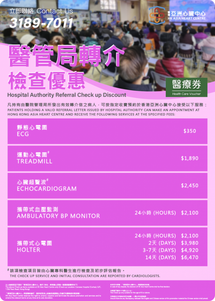 持有醫管局轉介信可享用之心臟檢查服務及收費... 凡持有由醫院管理局所發出有效轉介信之病人,可按指定收費預約於香港亞洲心臟中心接受以下服務: